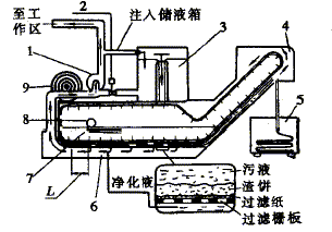 1.液壓泵 2.啟動閥 3.儲液箱 4.傳動裝置 5.污紙箱 6.真空(負壓)室 7.過濾箱 8.污液入口 9.過濾紙